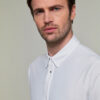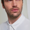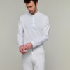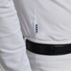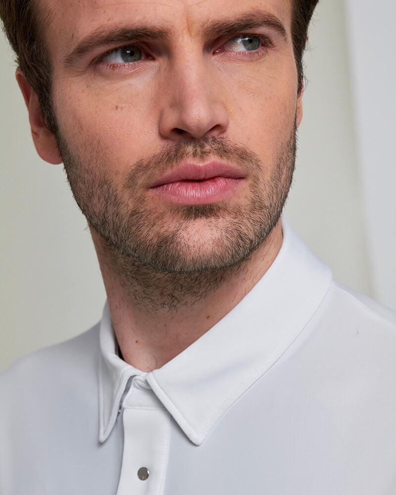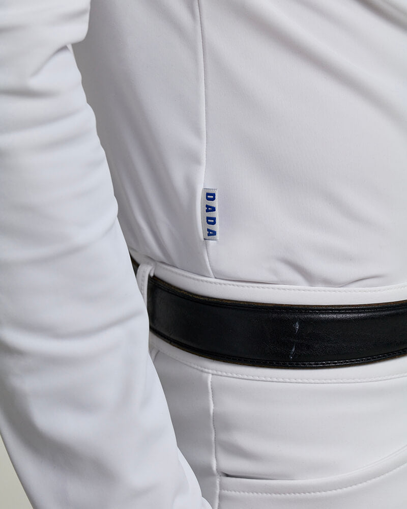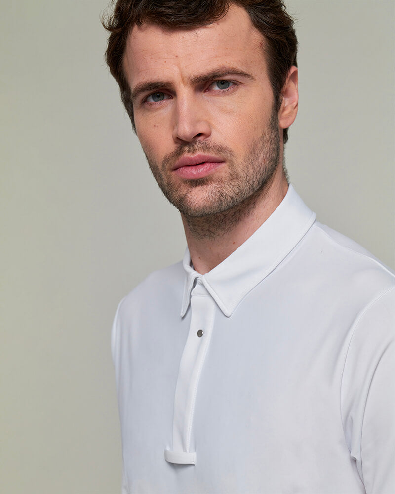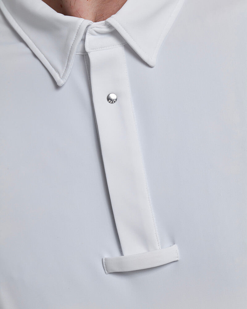 This very light competition polo shirt has been designed with a classic collar and a straight cut in order to meet the standards for being worn in competition. The snap buttons at the collar are invisible and a button placket with tie loop hides the buttons for a neat and elegant appearance. The garment is embellished with topstitching at the bottom and a DADA label sewn on the right side, adding a finishing touch to this piece.